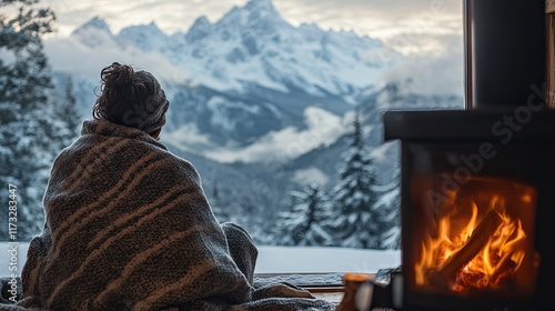 Person wrapped in a blanket sitting by a fireplace, looking at snowy mountains