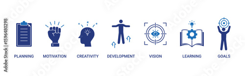 Personal Development plan icon set with planning, motivation, creativity, development, vision, learning, goals concept illustration