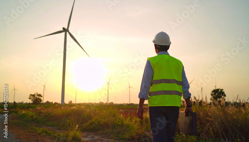 Personas usando chaleco reflectivo observando turbinas eólicas al atardecer, escena de energía renovable, sostenibilidad y medio ambiente con fondo cálido y cielo dorado