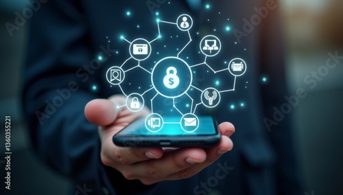 person's hand holding a phone, with various app icons and symbols emerging from the screen, suggesting connectivity and technology