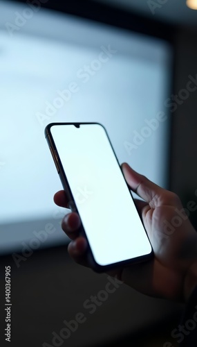 Person's hand using a smartphone app on a blank screen for presentation, digital, communication