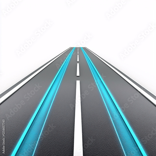 Perspective view of a gray road with white lines and two bright blue stripes running along the sides.