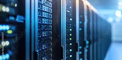 Perspective view of blue server rack corridor with illuminated equipment in a secured data center, perfect for modern tech and IT infrastructure ads