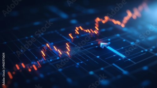 Perspective view of modern growing financial graph with rising up arrow on dark blue background with empty space for you logo. Investing, trading and stock market concept. Mockup, 3D Rendering.