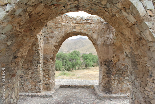 Perspective view of multiple stone arches from an ancient structure, showcasing architectural depth.