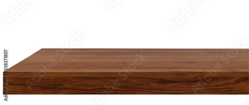 Perspective view of wood or wooden table top corner on white background including clipping path, template mock up for display products.