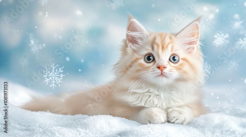 Pet in snowy landscape concept. A fluffy orange kitten lies on soft snow, surrounded by falling snowflakes, creating a serene winter scene