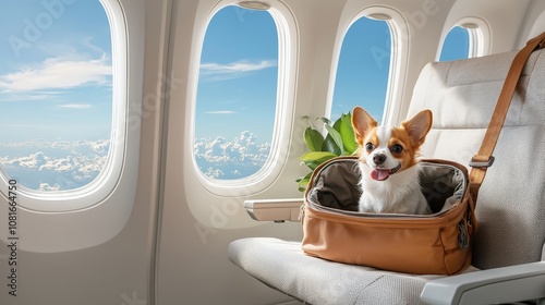 pet travel vacation road trip concept. A cheerful dog sits in a carrier by the airplane window, enjoying a view of the clouds and blue sky during a flight.