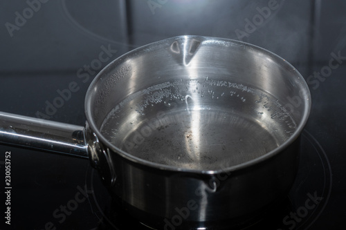 Pfanne, Topf mit kochendem Wasser auf Herdplatte