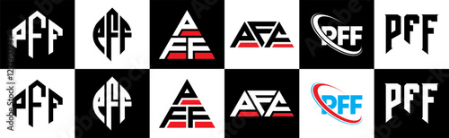PFF letter logo design in six style. PFF polygon, circle, triangle, hexagon, flat and simple style with black and white color variation letter logo set in one artboard. PFF minimalist and classic logo