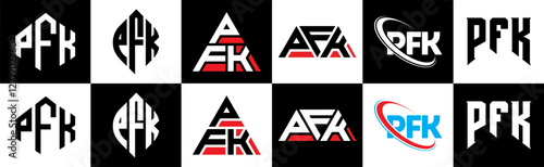 PFK letter logo design in six style. PFK polygon, circle, triangle, hexagon, flat and simple style with black and white color variation letter logo set in one artboard. PFK minimalist and classic logo