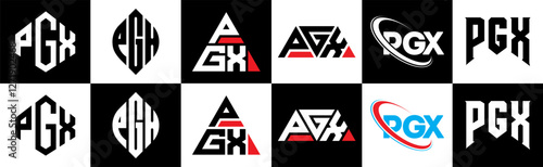 PGX letter logo design in six style. PGX polygon, circle, triangle, hexagon, flat and simple style with black and white color variation letter logo set in one artboard. PGX minimalist and classic logo