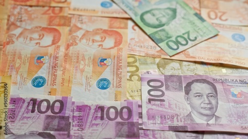 Philippine banknotes scattered, displaying various denominations and colorful designs, representing the republic of the philippines' currency in focus.
