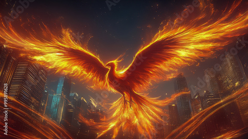 Phoenix Majestic fiery bird with glowing wings in dark sky, flames creating intense mystical scene