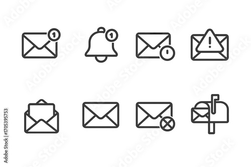 Phone and Email Alerts. Outline icon set of phone alerts: mobile phone ringing, vibration mode, message alert, notification bell,