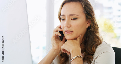 Phone call, business communication and woman by computer, negotiation or networking with mobile discussion. Contact, conversation and corporate deal with feedback, review email and pc in office