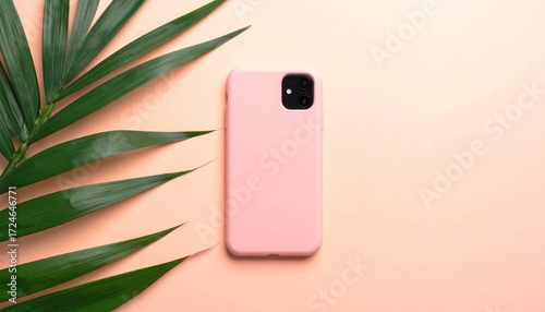 Phone in light pink case on a light peach background next to a palm frond offers a simple, stylish, and clean composition