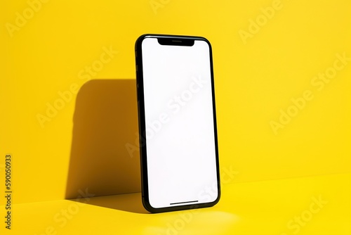 phone with blank screen isolated, closeup of a modern smartphone with an empty white screen on a yellow colored background