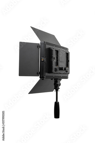 Photo and video lamp isolate on white back. LED lamp with special shutters for the formation of light flux. Photo and video lighting fixture.