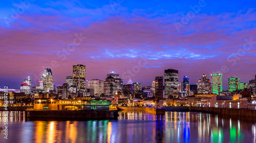 Photo de la ville de Montréal prise au début de la nuit. Le ciel est d'un bleu intense, les nuages rosés et les lumières de la ville se reflètent sur le fleuve Saint-Laurent.