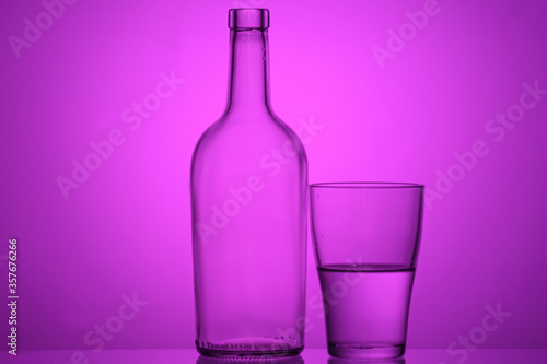 Photo of a bottle and half full glass with backlighting on a purple background. stacked objects