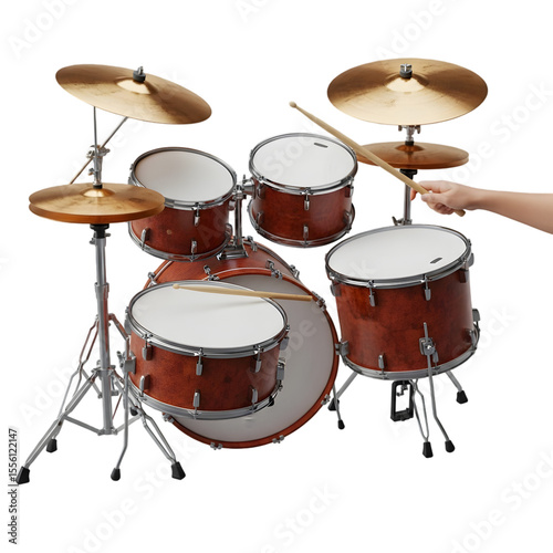 Photo of a brown drum kit, isolated on transparent background, is shown with a hand holding drumsticks, ready to play, capturing the energy and excitement of a musical performance
