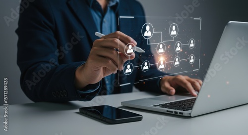 Photo of a businessman visualizes a network connection and team collaboration structure on a laptop