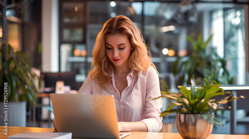 Photo of a businesswoman sitting at a table with a laptop computer. Ai generated.