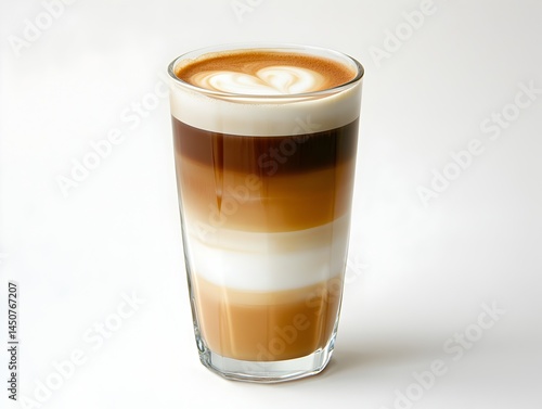 Photo of a glass of layered latte with frothy milk, perfectly capturing a creamy coffee moment