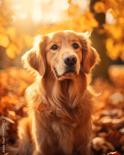 photo of a golden retriever dog against a background of autumn leaves сreated with Generative Ai