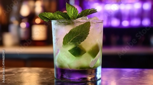 Photo of a mojito in an old-fashioned glass, garnished with lime and mint leaves on top.