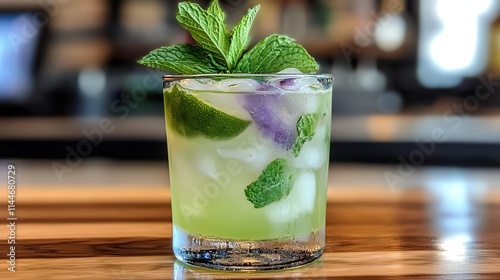 Photo of a mojito in an old-fashioned glass, garnished with lime and mint leaves on top.