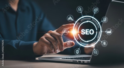 Photo of a person interacts with a digital interface displaying seo and various icons, representing search engine optimization strategies