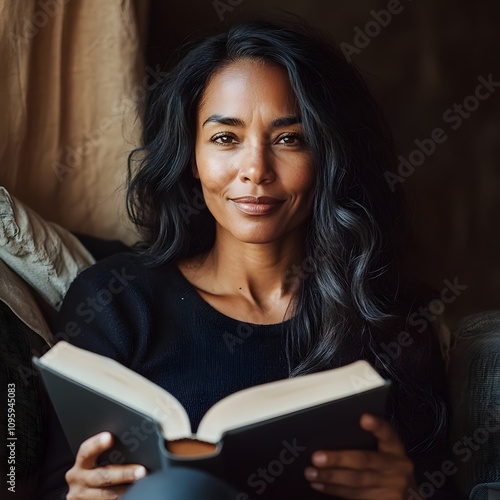 Photo of A relaxed trendy mixed-race african middle aged woman with long wavy hair with book
