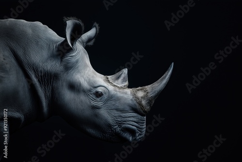 Photo of a rhino isolated against a black background, emphasising the rhino's majestic features. Wildlife and conservation concept, space for copy.