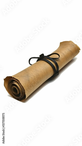 Photo of a Rolled Parchment Scroll on a White Background with Black Ribbon