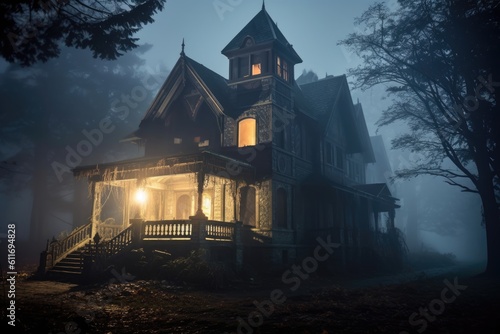 Photo of a scary house in a mysterious woodland. Halloween concept. Generative AI