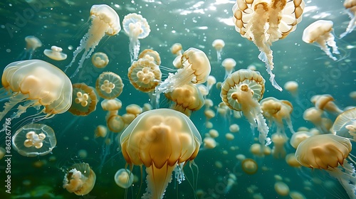 Photo of a school of jellyfish shot direction from above pose floating in water time of day midday