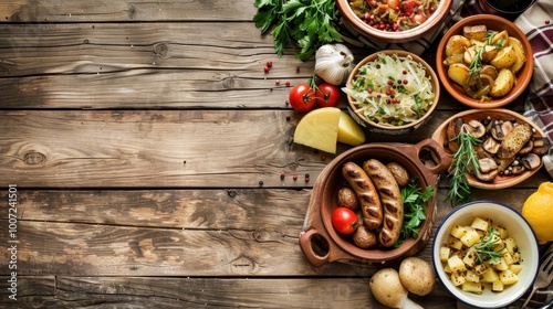 Photo of a traditional Bavarian meal with sausages, fried potatoes, and sauerkraut, served on a rustic wooden table --chaos 20 --ar 16:9 --v 6 Job ID: 299c2e22-a5f9-4b73-9f47-f6b70db975a3