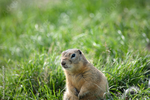 photo of a wild ground squirrel in its natural habitat, in summer on a green meadow. close-up