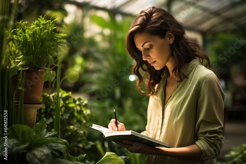 Photo of a woman engrossed in writing inside a lush greenhouse