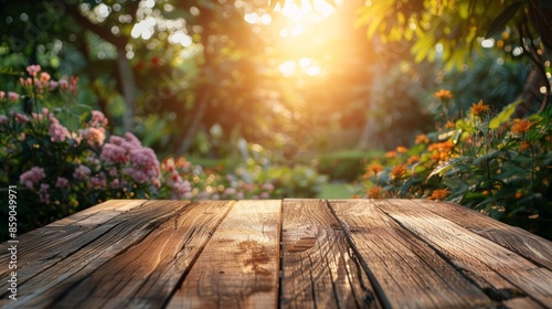Photo of a wooden table with a blurred background in the garden at sunset, space with product display and bokeh effect, summer concept