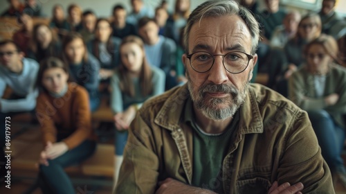 Photo of an adult professor giving a lecture to a group of university students and looking at the camera.