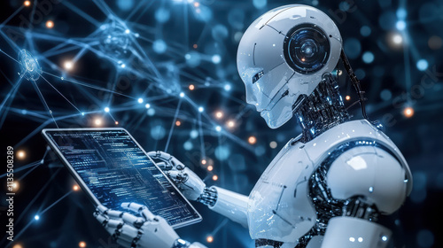 Photo of an AI robot using a digital tablet to plan and read data against the background of technological neural networks