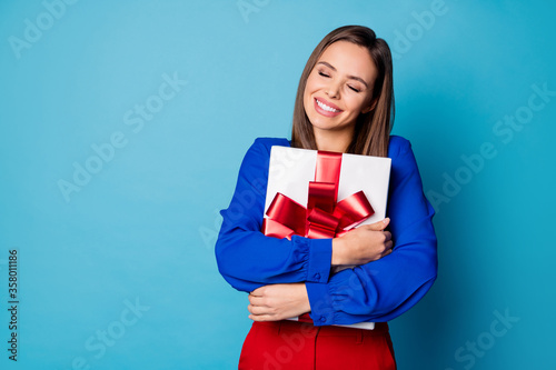 Photo of attractive business lady hold arms big giftbox eyes closed present from boss colleagues wear red luxury trousers suit blouse shirt isolated blue color background
