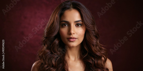 Photo of beautiful Middle Eastern woman with long, thick, wavy hair against a deep burgundy background.