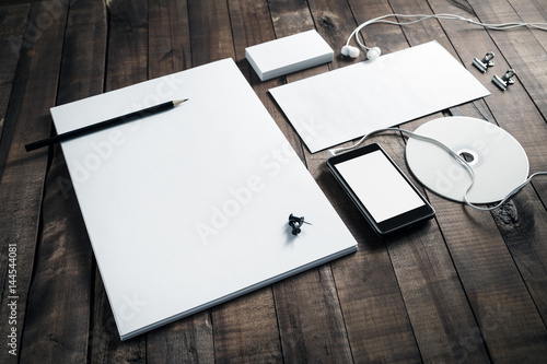 Photo of blank stationery set. Template for corporate identity. Mockup for branding identity for designers. Responsive design mock up.