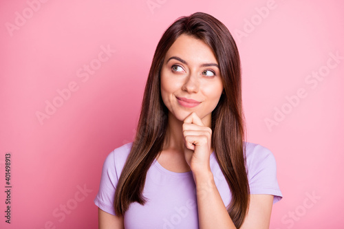 Photo of cute thinking woman touch chin look empty space wear casual cloth solated on pink color background