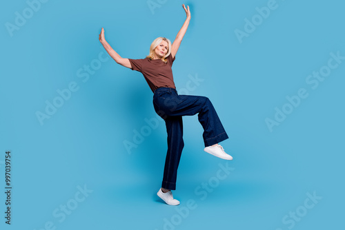Photo of funny cheerful glad woman wear trendy brown clothes dance rejoice win isolated on blue color background