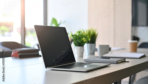 Photo of open laptop with visible screen on table in office meeting room, modern workspace, minimal composition